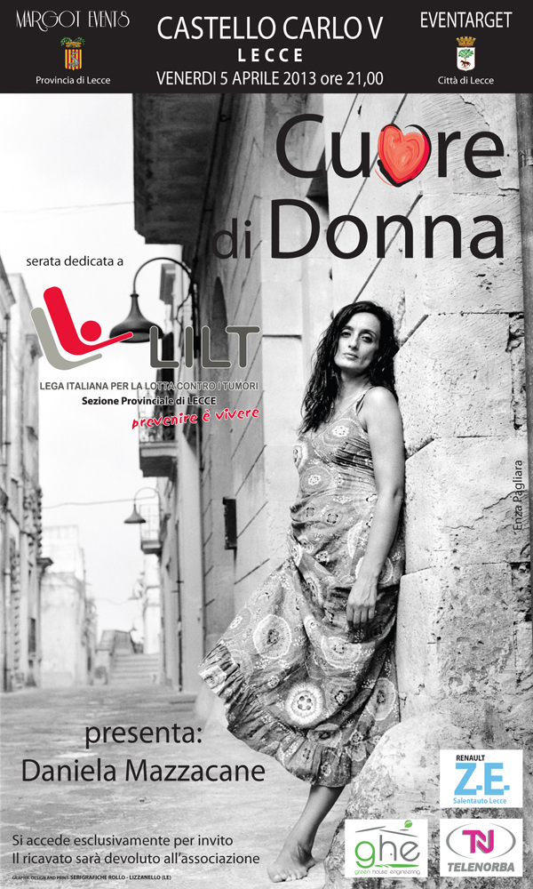 La grande moda e la LILT, Lega Italiana per la Lotta ai Tumori, saranno i protagonisti indiscussi di un’intera serata di solidarietà dedicata alle donne venerdì 5 aprile 2013 a partire dalle ore 21. Ad ospitare l’evento “Cuore di donna” sarà l’originale e affascinante cornice del castello Carlo V a Lecce, che vedrà sfilare all’interno della sala “Maria d’Enghien” le creazioni di stilisti ed artisti salentini affermati ed emergenti.