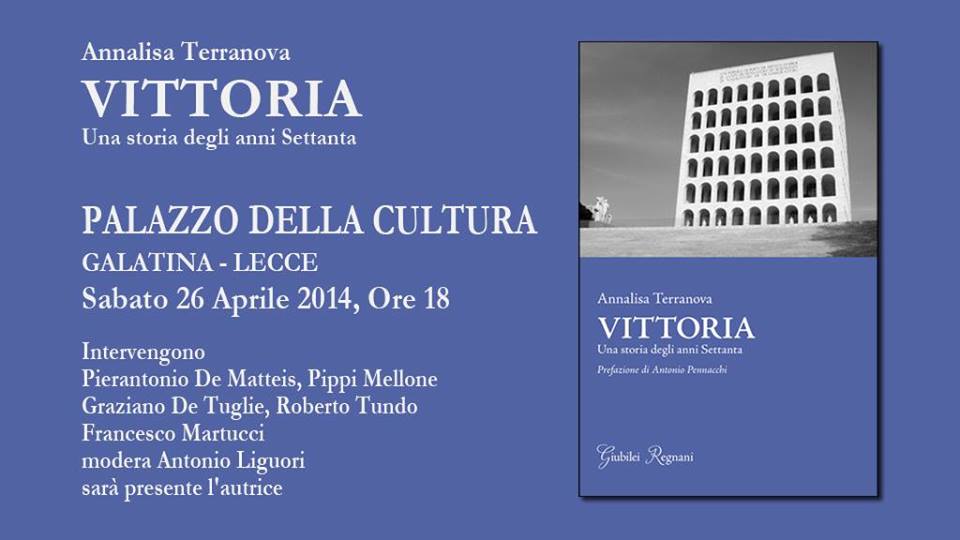 Sabato 26 aprile, a partire dalle ore 18, presso la sala dell’Università Popolare di Galatina, all’interno del Palazzo della Cultura, Libreria Fabula, l’Associazione Culturale “La Fornace” e l’Associazione Culturale “Andare Oltre” presentano “Vittoria. Una storia degli anni Settanta”, l’ultimo libro di Annalisa Terranova. Alla presenza dell’autore, parteciperanno al dibattito sul libro Pippi Mellone, Graziano De Tuglia, Roberto Tundo, Francesco Martucci e Pierantonio De Matteis. Modererà l’incontro Antonio Liguori de “La Gazzetta del Mezzogiorno”.