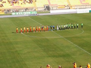 L’incontro inizia subito con una fiammata di Carrozza che al 4′ prova un tiro a giro sul secondo palo e sfiora il goal; il numero nove giallorosso continua a spingere e al 22′ regala un cross a Moscardelli che insacca il pallone in rete e porta in vantaggio il Lecce. La squadra di casa rimane propositiva e sfiora il raddoppio con Salvi che con uno slalom supera la difesa avversaria e tira centralmente trovando l’opposizione di Fumagalli. La prima frazione di gioco termina con un ultimo brivido per il Lecce: Lepore si ritrova davanti alla porta avversaria grazie ancora a un passaggio di Carrozza. Il tiro del numero undici giallorosso viene però deviato da un difensore avversario che sventa l’azione del Lecce.