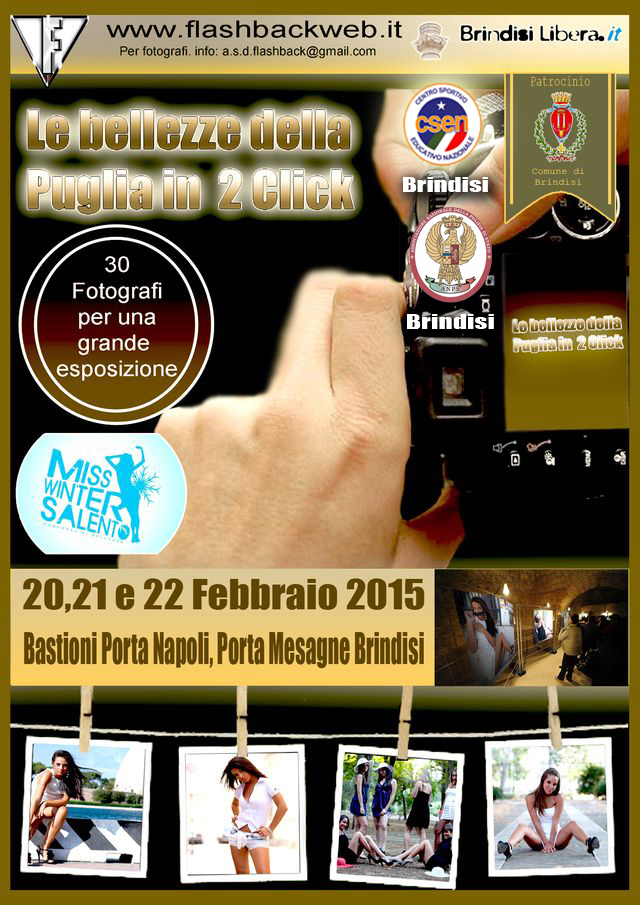 Il nuovo progetto avviato dalla Associazione Flashback di Brindisi vuole trattare la tematica della bellezza delle donne nel contesto del territorio Pugliese. Scoprire e raccontare al femminile tramite la fotografia i luoghi e i paesaggi caratteristici che contraddistinguono il territorio pugliese attraverso l’arte dei fotografi dilettanti amatori o professionisti che aderiscono al progetto, per un appuntamento espositivo nello storico Bastione di Porta Napoli di Brindisi nei giorni 20,21 e 22 febbraio 2015 il cui ingresso sarà gratuito.