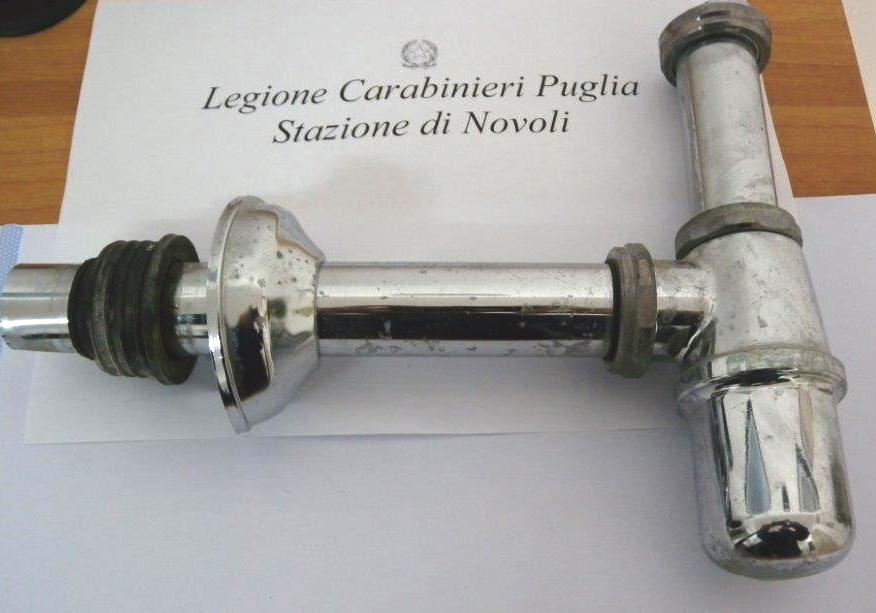 A fine partita i tifosi del Novoli lasciavano gli spalti per raggiungere rapidamente la strada prospicente l’uscita dello spalto occupato dai tifosi locali. Nonostante i numerosi tentativi dei militari di riportare l’ordine, decine di tifosi locali superavano la linea posta come limite dai militari operanti lanciando sassi all’interno del campo sportivo, intonando cori e compiendo gesti indecorosi. Alcuni tifosi entrati nei bagni rompevano lavandini e water da utilizzare successivamente contro la compagine sportiva opposta, avviando così una vera e propria sassaiola con i cocci. Un tifoso in particolare, un bitontino ventottenne prelevava dai bagni un sifone in ferro (nella foto) e lo scagliava contro i Carabinieri che evitavano in quel contesto di fermarlo per non arrecare ulteriori problemi di ordine pubblico, riuscendo tuttavia ad indentificarlo. Il ragazzo veniva infatti arrestato nelle ore successive per lancio di materiale pericoloso e resistenza a pubblico ufficiale.