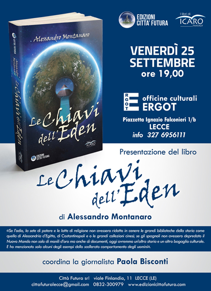 Venerdì 25 settembre si terrà la presentazione del libro ‘Le Chiavi dell’Eden’ scritto da Alessandro Montanaro. Il volume, edito da Edizioni Città Futura di Lecce, è il primo di una trilogia che inaugura la collana Fantasy appena ideata dalla casa editrice leccese. Un progetto editoriale nuovo che intende dare spazio a un genere ritenuto da sempre appassionante poiché fonda fantasia, immaginazione, miti e soprannaturale dando vita a un tipo di letteratura affascinante che negli ultimi tempi si è sviluppato in maniera esponenziale. Con ‘Le Chiavi dell’Eden’ Edizioni Città Futura ha individuato il lavoro ideale per dare inizio a una collana editoriale che si prospetta già di notevole interesse.