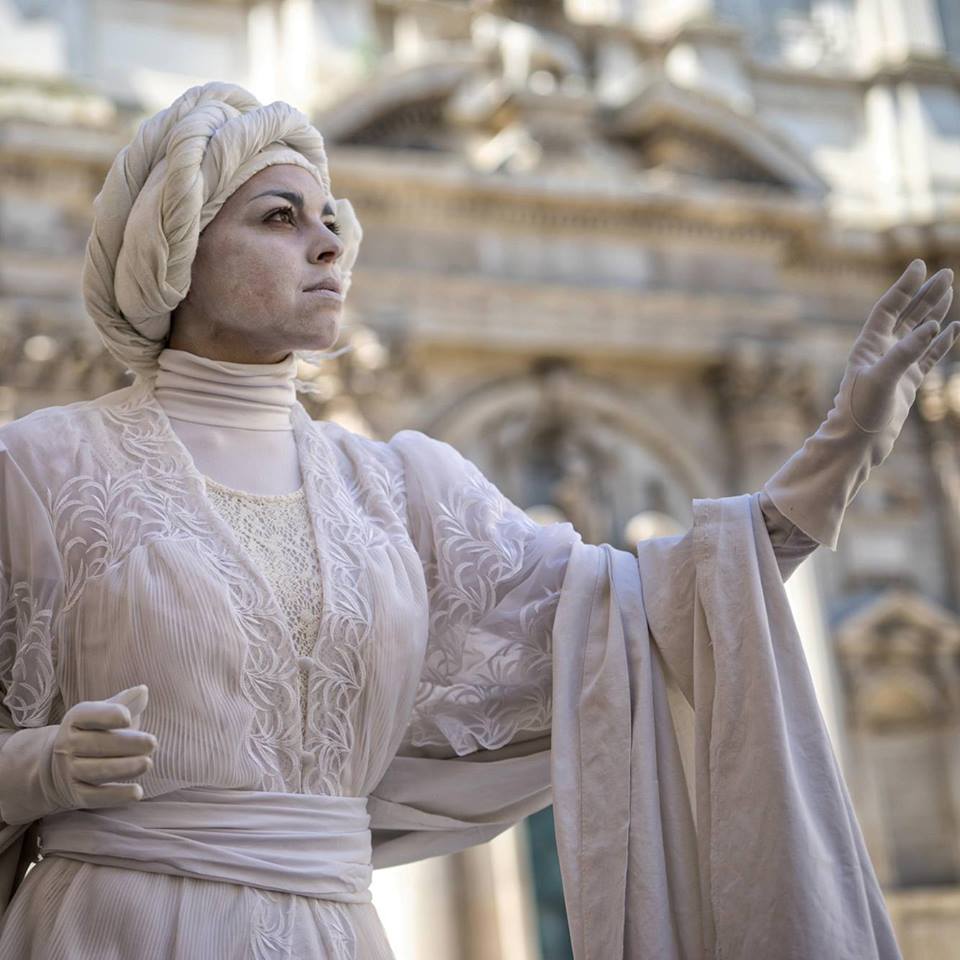 Infatti, avevamo già notato che l’artista ha una pagina Facebook…Precisiamo che a Lecce è solita esibirsi in via Vittorio Emanuele II, nei pressi della Galleria Maccagnani. dove sarà facile poterla ammirare nelle sue azioni artistiche teatrali, che regalano momenti di emozioni intense agli occasionali passanti.