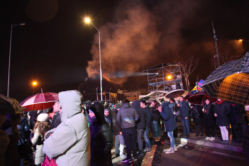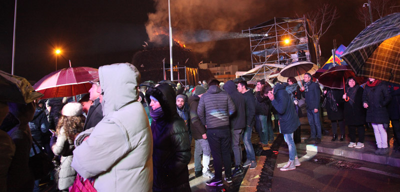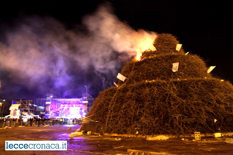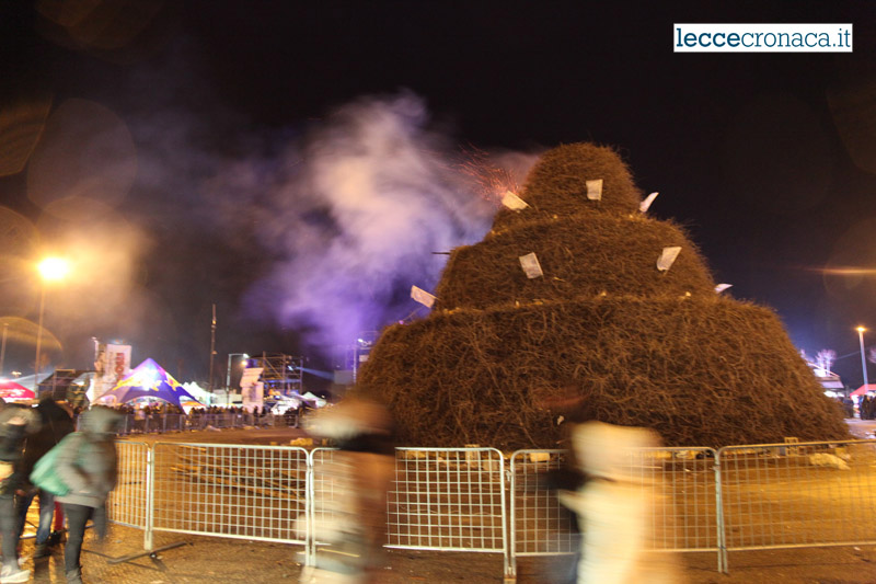 Nonostante la pioggia battente, migliaia di persone hanno assistito alla tradizionale accensione della Focara, il falo più grande del Mediterraneo, acceso stasera a Novoli in omaggio a Sant’Antonio Abate.