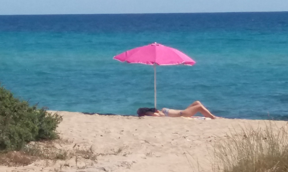Questa volta siamo alla periferia di Porto Cesareo, un mare d’incanto una sabbia dorata un fanciulla splendida sotto un ombrellone rosa-fucsia, ma poi ecco comparire ” le installazioni” del solito artista sporcaccione.