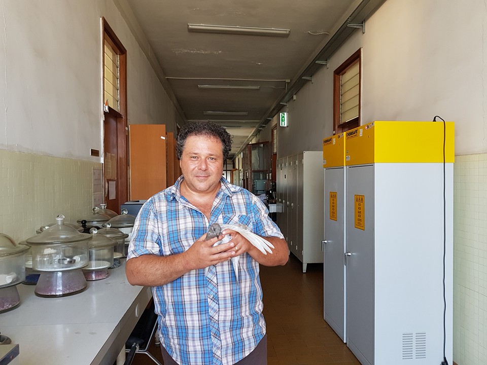 Il nostro amico biologo dell’ Arpa Puglia Roberto Gennaio tre giorni fa ha salvato un colombo che, introdottosi in maniera furtiva nella sede del Dipartimento di Lecce, avrebbe voluto fare esperimenti di chimica.