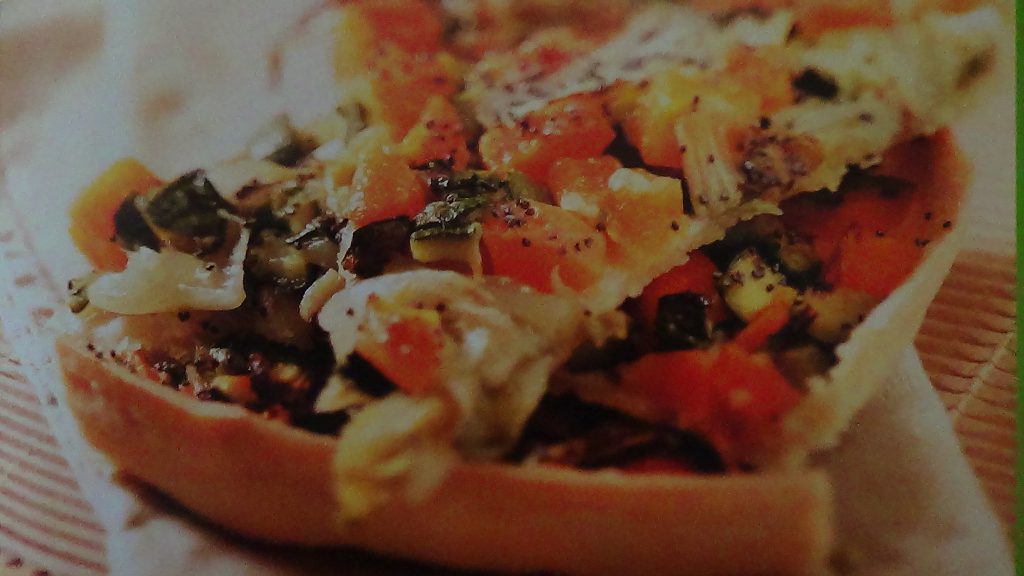 Stendete la pasta brisée,in una teglia da forno (bucherellate sempre, questi fondi). Cospargete con le verdure e livellate.