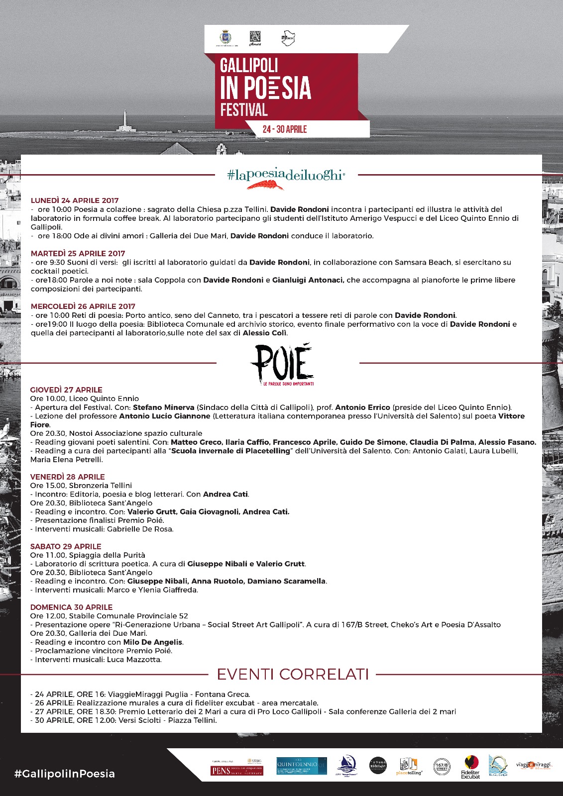 Il primo, spiegano gli organizzatori, è “caratterizzato dal laboratorio tenuto dal poeta Davide Rondoni, ripartirà quest’anno dalla Città di Gallipoli, per mettere in risalto la poesia insita nelle sue tradizioni, nei suoi luoghi, nei suoi talenti artistici e manifatturieri, così come nelle sue produzioni.
