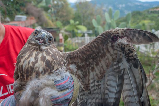 Il terzo, una poiana, purtroppo aveva avuto un’ ala intera fratturata dai pallini dei cacciatori, che dovrebbero vergognarsi, di andare in giro a sparare agli uccelli; sarà tutto legale, ma che squallore, uccidere e massacrare le creature viventi, pur con tutte le licenze e i permessi di questo mondo! (a parte il fatto che la Poiana è una specie protetta: nella foto, un altro esemplare ferito a fucilate a ottobre, e curato dalla Lipu a Lavagna).