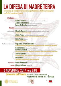 Lunedì prossimo, 6 novembre, ci sarà a Lecce una giornata di riflessione in Ateneo su “La difesa di madre terra – processi di trasformazione capitalistica delle campagne e diritti costituzionali”. Il tema, risulta subito evidente, è estremamente importante, interessante e quanto mai attuale e i relatori sono certamente all’altezza della situazione (nella locandina sotto), per cui sarà un evento assolutamente da non perdere.