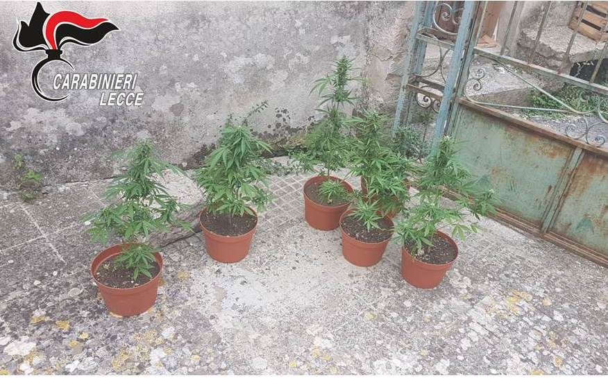 A Muro Leccese, Gabriele Maggiulli, 22 anni, anch’ egli con precedenti, trovato in possesso di seicentocinquantasei rammi di marijuana, e otto piante di cannabis (nella foto).