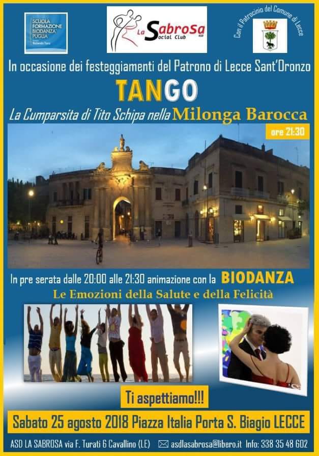 Lo spettacolo di Tango, che ha anche lo scopo di far conoscere la nostra identità culturale e le nostre bellezze artistiche, avrà inizio alle ore 21.30 e sarà preceduto dalle ore 20,00 da una manifestazione di BIODANZA con gli allievi delle scuole di Biodanza di Milano, Bari e Lecce, che inviteranno e coinvolgeranno il pubblico presente, facendolo muovere e danzare liberamente per scoprire il piacere spontaneo e naturale di abbandonarsi alla musica e alla relazione con l’altro. La Biodanza è una disciplina bionaturale, ideata nel 1966 dal prof. Ronaldo Toro antropologo e psicologo, che attraverso la musica e la gestualità naturale del corpo e il contatto con gli altri stimola la gioia di vivere.”