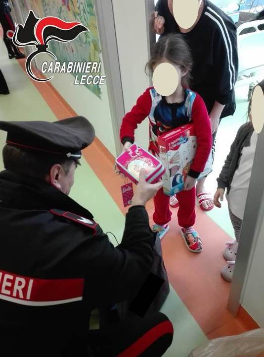 (Rdl)______Bella iniziativa di solidarietà dei Carabinieri della Compagnia di Lecce, che questa mattina si sono recati nei reparti di pedriatia dell’ ospedale Vito Fazzi per distribuire doni e sorrisi ai venticinque bambini ricoverati.