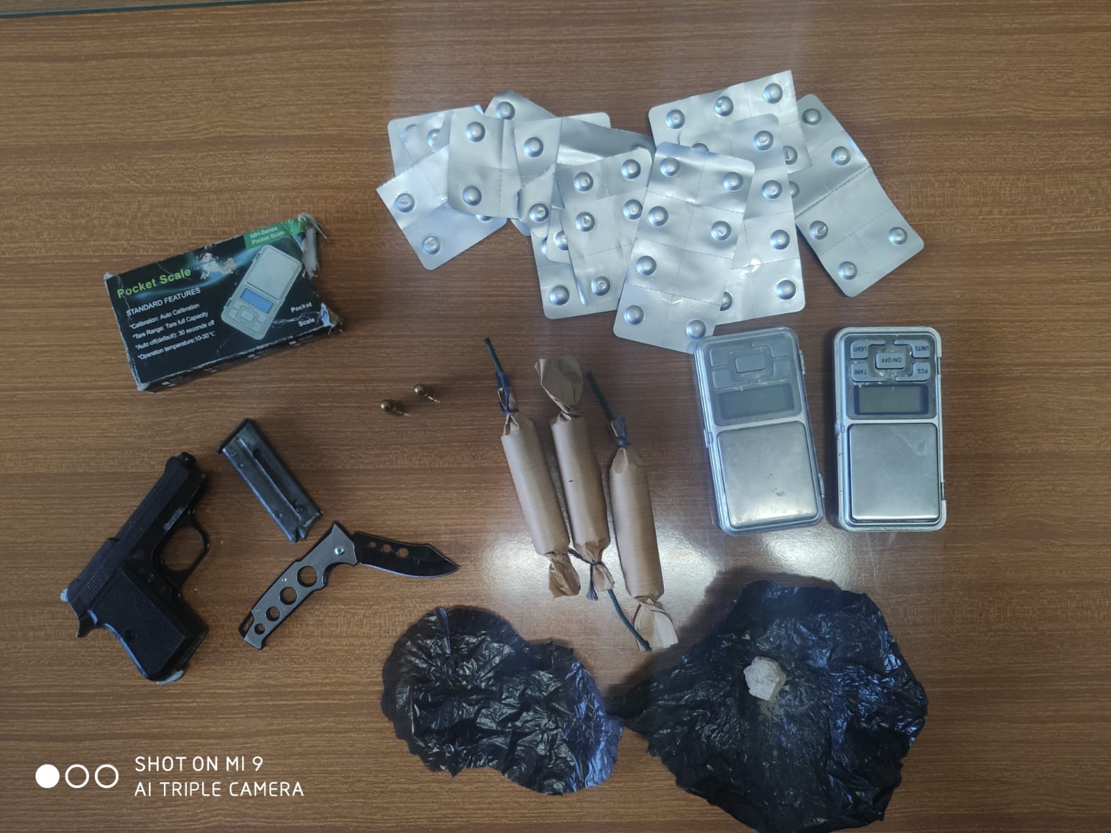 Arrestato e portato in carcere anche un giovane di Poggiardo, Francesco Maggio, 35 anni, con precedenti specifici, trovato in possesso in casa sua di sei grammi di eroina, due bilancini di precisione, ottanta pastiglie di metadone e di una pistola calibro 22 marca con matricola abrasa con relativo caricatore (nella foto).