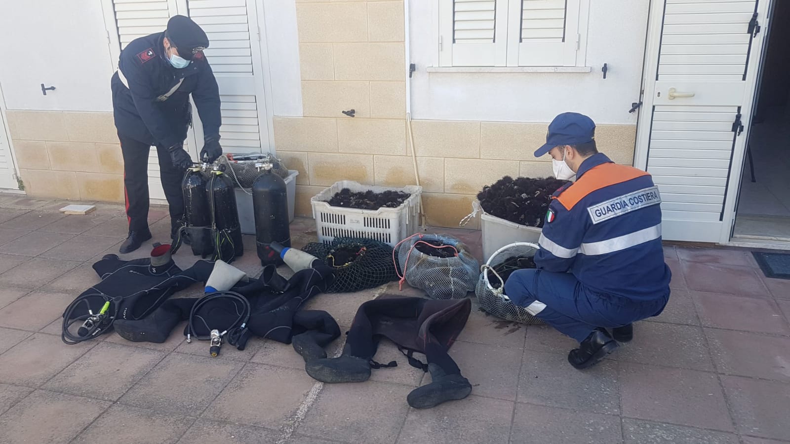 (e.l.)______Dalle prime luci dell’alba, pescavano ricci di mare all’interno della Riserva naturale di Porto Cesareo, area protetta. In quantità ingenti, a migliaia. Ma non sono sfuggiti al sistema di videosorveglianza, per cui questa mattina sono intervenuti i Carabinieri. Tutti i pescatori di frodo, ai quali è stata anche sequestrata l’attrezzatura (nella foto), sono stati denunciati e multati; duemila cinquecento ricci, ancora vivi, sono stati ributtati in mare.