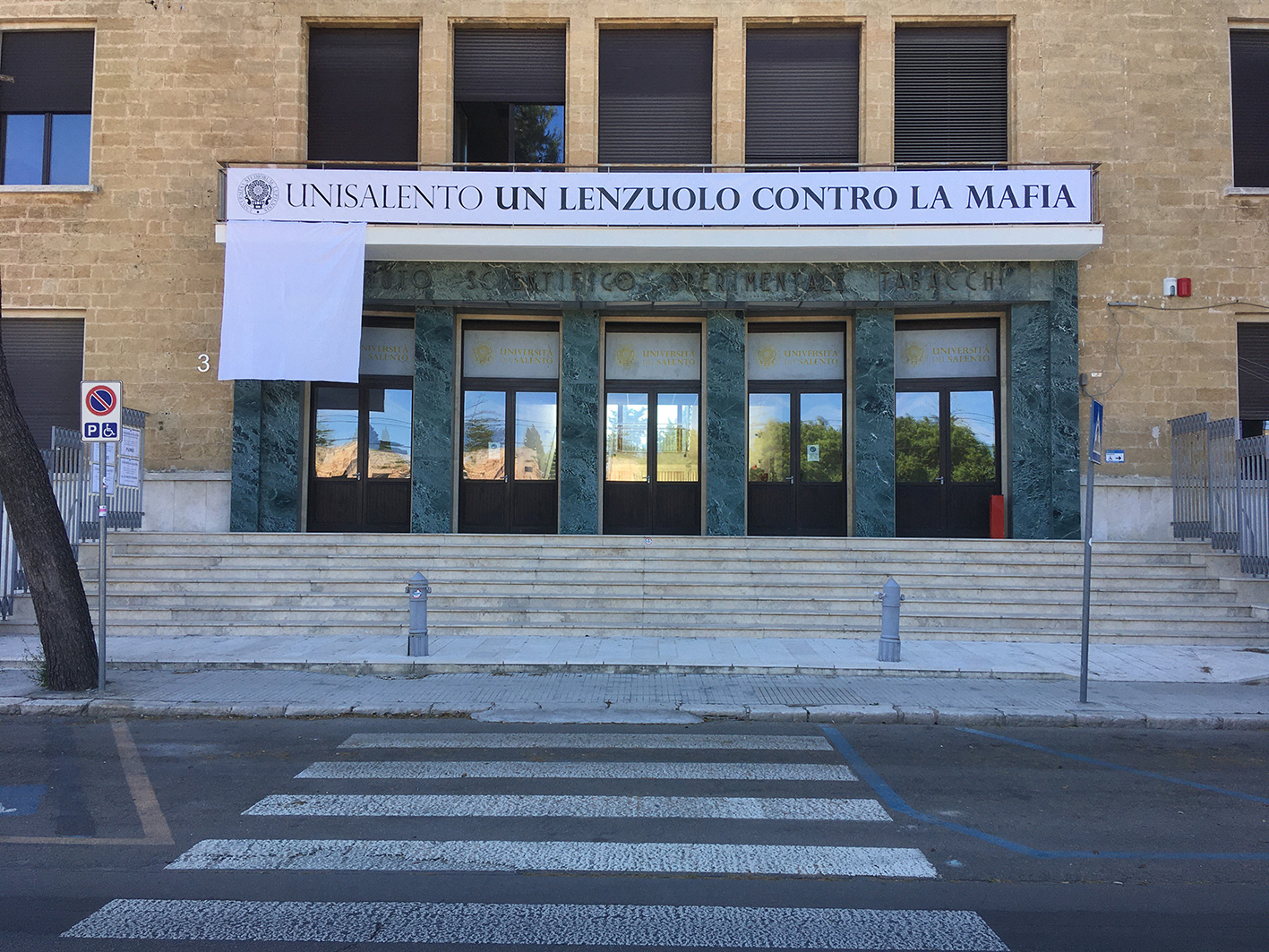 Nell’occasione l’UniSalento ha fatto esporre uno striscione e un lenzuolo bianco sono sulla facciata della sede “Sperimentale 2” di via Calasso a Lecce (nella foto).
