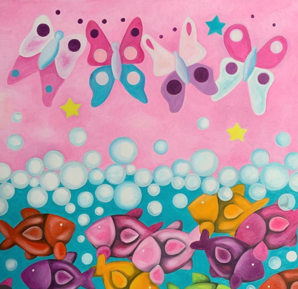 La sua è dunque un’apologia della fauna marina, ma anche delle farfalle che usano i venti per planare su nuove gioie. Grandi bolle d’ossigeno occupano questo mondo immaginifico, tra il mare e la terra, danno aria e il respiro che è mancato a noi negli ultimi due anni e che manca sempre più alla natura.