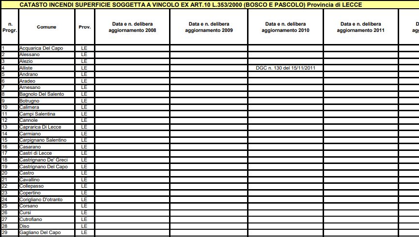 Abbiamo di fronte a noi non solo la ribalta di un fenomeno che non è iniziato negli ultimi anni, ma anche e soprattutto, un evento ignorato per più di un decennio e finito nel dimenticatoio. Il titolo del documento sotto esame parla chiaro: “CATASTO INCENDI SUPERFICIE SOGGETTA A VINCOLO EX ART. 10 L. 353/2000 (BOSCO E PASCOLO) Provincia di Lecce ”.