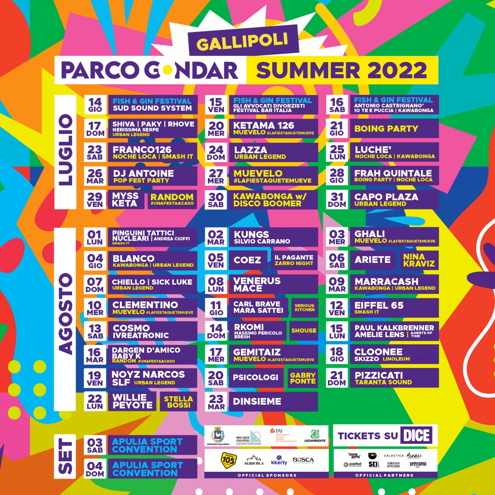 Questo il calendario della nuova edizione Parco Gondar 2022, che ospita al suo interno le date dei principali tour estivi nazionali e internazionali: Shiva, Rhove e Paky (17 luglio), Ketama 126 (20 luglio), Boing Party (21 luglio), Franco 126 (23 luglio), Lazza (24 luglio), Luchè (25 luglio), Dj Antoine (26 luglio), Muevelo (27 luglio), Frah Quintale (28 luglio), Miss Keta + Random (29 luglio), Kawabonga w/ Disco Boomer (30 luglio), Capo Plaza (31 luglio), Pinguini Tattici Nucleari (1 agosto), Kungs (2 agosto), Ghali (3 agosto), Blanco (4 agosto), Coez (5 agosto), Il Pagante (5 agosto), Ariete (6 agosto), Nina Kraviz (6 agosto), Chiello, Sick Luke (7 agosto), Venerus, Mace (8 agosto), Marracash (9 agosto), Clementino (10 agosto), Carl Brave, Mara Sattei (11 agosto), Eiffel 65 (12 agosto), Cosmo, Ivreatronic (13 agosto), Rkomi, Massimo Pericolo, Bresh (14 agosto), Paul Kalkbrenner, Amelie Lens (15 agosto), Dargen D’Amico, Baby K, Random (16 agosto), Gemitaiz (17 agosto), Cloonee (18 agosto), Noyz Narcos, SLF (19 agosto), Psicologi (20 agosto), Gabry Ponte (20 agosto), Pizzicati – Taranta Sound (21 agosto) Willie Peyote (22 agosto), Stella Bossi (22 agosto), Dinsieme (23 agosto).