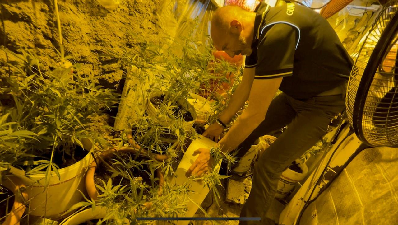 Scoperti e sequestrati ventotto dosi di cocaina, due di marijuana, tre bilancini di precisione, e quarantanove piante di marijuana, coltivate in un bunker sotterraneo (nella foto) .
