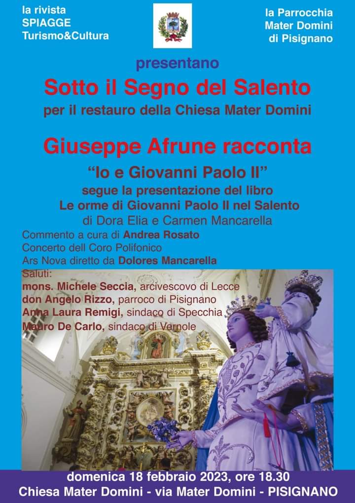 Domenica 18 febbraio, alle 18.30, con la presenza di Monsignor Michele Seccia, arcivescovo di Lecce, è previsto l’intervento di Giuseppe Afrune che racconta la sua affascinante esperienza come artista apprezzato da Giovanni Paolo II. É, poi, prevista la presentazione del libro di Dora Elia e Carmen Mancarella intitolato ‘Le orme di Giovanni Paolo II nel Salento’, con il commento di Andrea Rosato.