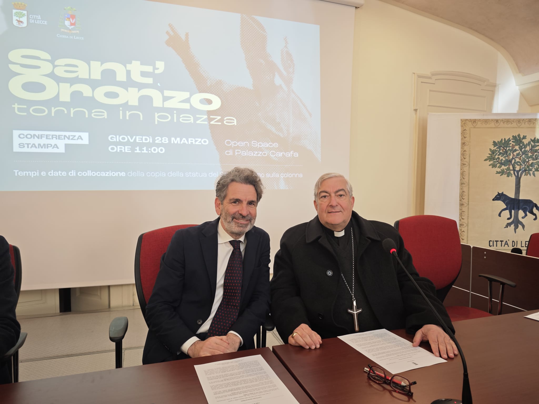 «Come pastore di questa Chiesa locale, fondata da Sant’Oronzo, sono felice per questo traguardo. Mi sembra un sogno – dichiara l’arcivescovo Seccia – dopo tanti anni di solitudine della colonna della Piazza antica di questa città. Il ritorno della copia della statua al suo posto mi fa pensare al ritorno di un faro. Per noi cristiani, i santi sono fari che con il loro esempio illuminano il cammino di chi sceglie di seguire Cristo. Questo ritorno sulla sua colonna che da secoli rappresenta un punto di riferimento, un segno di riconoscimento di una comunità che a sua volta dà significato ai segni. Per noi credenti il santo patrono, infatti, è più di un simbolo e vale più della bandiera perché la fede e la devozione superano le barriere spazio-temporali e vanno oltre la successione dei fatti della storia. Grazie all’amministrazione comunale e a tutti gli enti coinvolti per la passione e la professionalità profuse in questa operazione per nulla facile. E grazie anche a chi ha contribuito con le donazioni affinché la statua originale di Sant’Oronzo fosse riportata all’antico splendore e la sua copia tornasse finalmente in piazza».