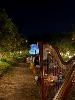 Suggestiva e di particolare effetto l’ambientazione tra i filari di melograni opportunamente illuminati, tra i quali risuonano le delicate note prodotte da un’arpa, le cui note sono dolcemente pizzicate dal vivo da mani avvezze alla musicalità di professione.