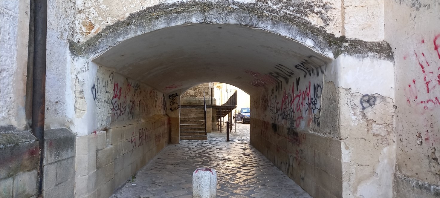 La strada pedonale sotto “l’arco” della Chiesa è uno dei luoghi più suggestivi del centro storico di Veglie, è sicuramente ancor più emozionante scambiarsi baci e abbracci appartati nel breve attraversamento basolato con volta ribassata.
