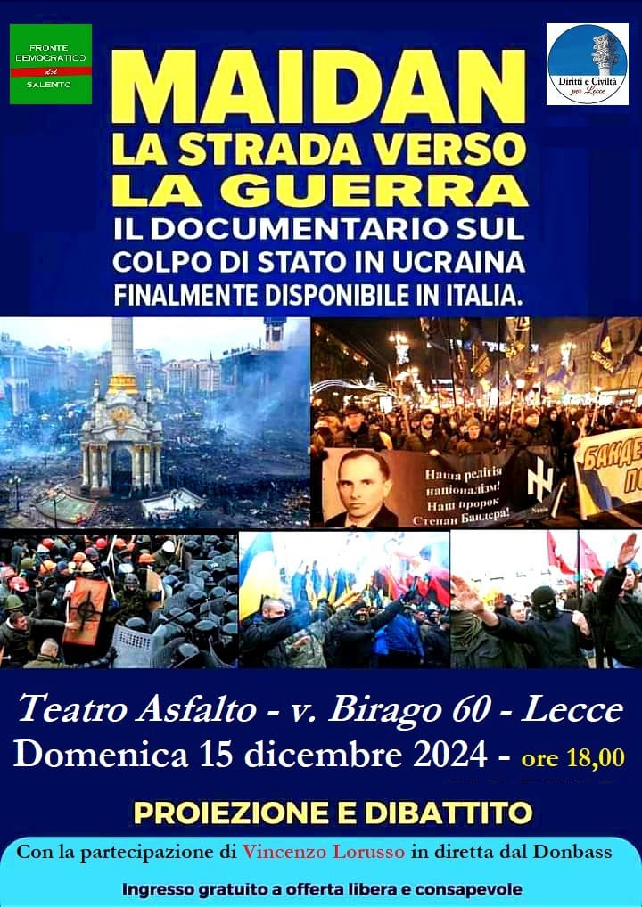 Con la partecipazione di Vincenzo Lorusso in diretta dal Donbass, si svolgerà domenica 15 dicembre la proiezione del documentario sul colpo di stato in Ucraina “Maidan. La strada verso la guerra” presso Asfalto Teatro in via Birago 60 Lecce ore 18.