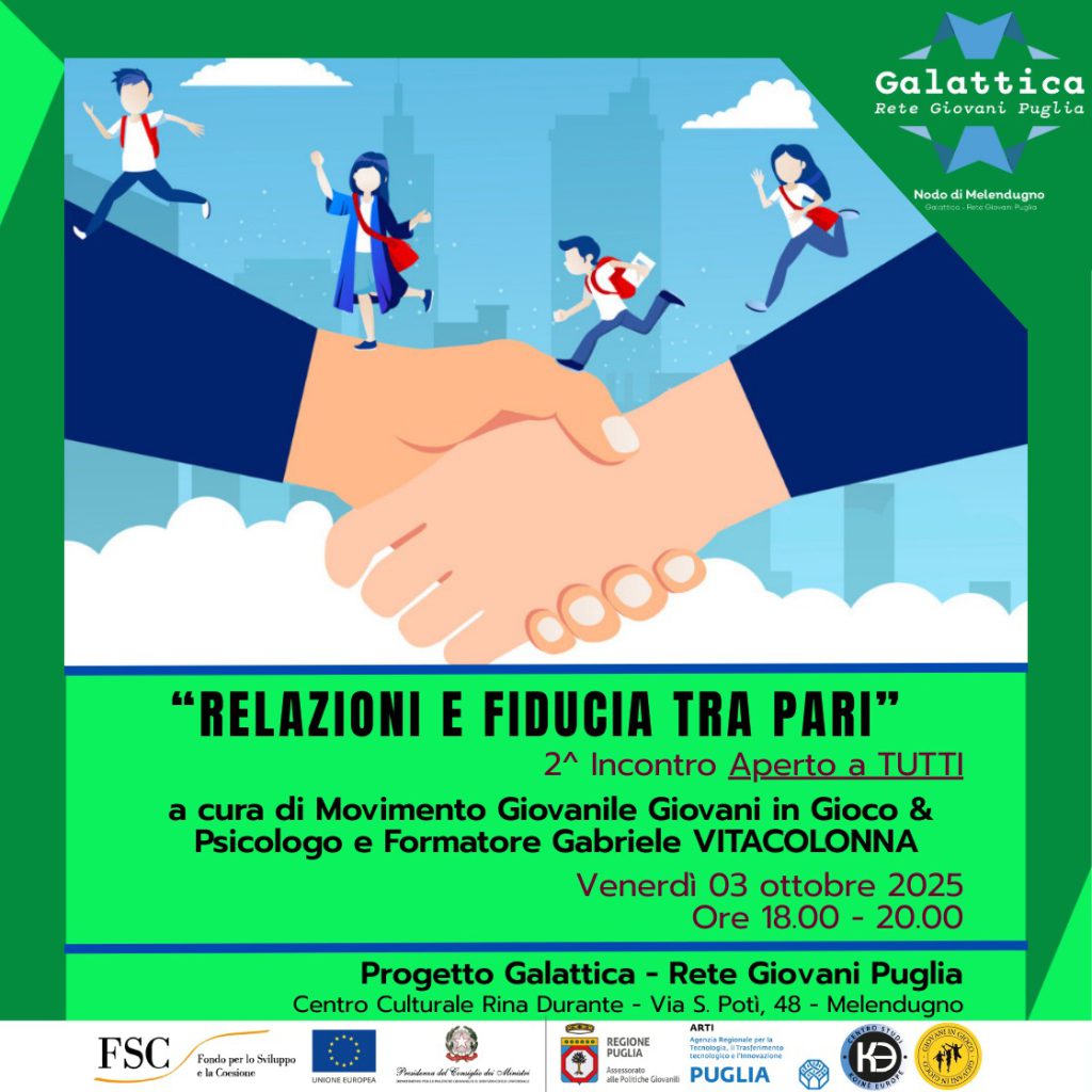 Il Team Nodo Galattica di Melendugno, con capofila il Centro Studi Koinè Europe, da sempre attento ai bisogni educativi e formativi del territorio su cui opera significativamente ormai da molti anni, insieme al Servizio Civile Regionale vi aspettano per il secondo incontro dal titolo: “Relazioni e fiducia tra pari”.