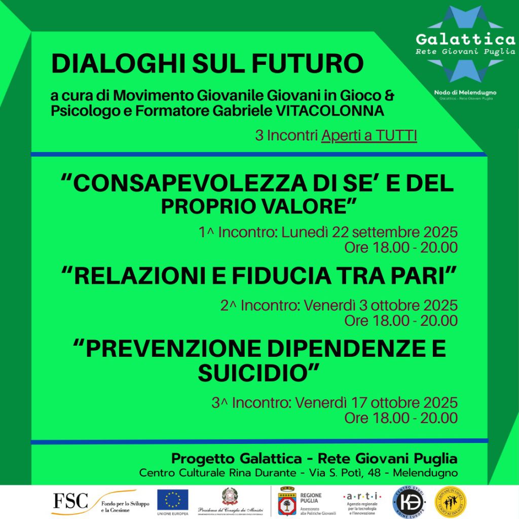 Lo scorso 22 settembre ha avuto avvio a Melendugno, presso il Centro Culturale “Rina Durante”, un importante progetto dal titolo “Dialoghi Sul Futuro”, creato dai ragazzi del Movimento Giovanile Giovani in Gioco, coordinato da Marco Macchione e Nicolò Camassa, in collaborazione con l’esperto Psicologo e Formatore Gabriele Vitacolonna.