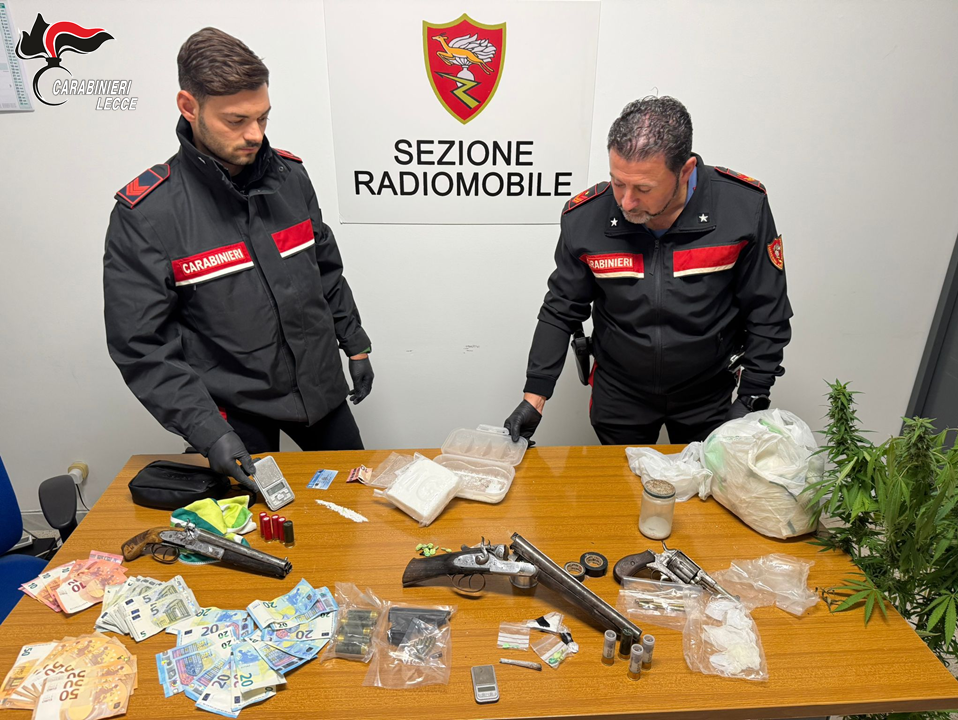 Le verifiche si sono poi estese alle abitazioni dei fermati, entrambe a Veglie. In una prima casa sono stati rinvenuti 6 grammi di cocaina già suddivisi, bilancini di precisione e materiale per confezionare le dosi. Ma la scoperta più grave è avvenuta nella seconda abitazione: i Carabinieri hanno trovato un fucile a canne mozze, una pistola, un revolver con matricola cancellata, numerose munizioni di vario calibro e due piante di marijuana di circa un metro, in piena fioritura.