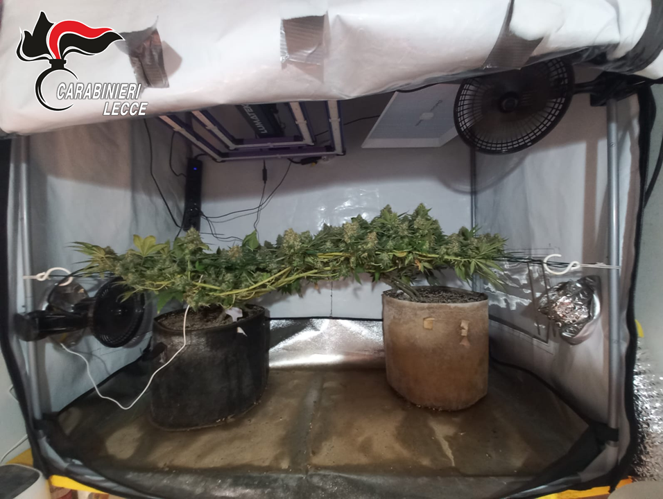 Le verifiche sul territorio sono poi proseguite con nuovi controlli mirati. Nel corso di un’ispezione relativa ad alcune armi regolarmente denunciate da un residente, i Carabinieri hanno notato la presenza di residui di sostanza vegetale riconducibili a marijuana. La scoperta ha condotto a una seconda perquisizione domiciliare che ha portato al rinvenimento di 25 grammi di marijuana già confezionata, 345 grammi della stessa sostanza in essiccazione e sei piante di canapa indiana coltivate in due piccole serre domestiche dotate di lampade a led, sistemi di ventilazione e termoregolatori. Anche in questo caso, il responsabile è stato arrestato per detenzione e coltivazione illecita di stupefacenti.