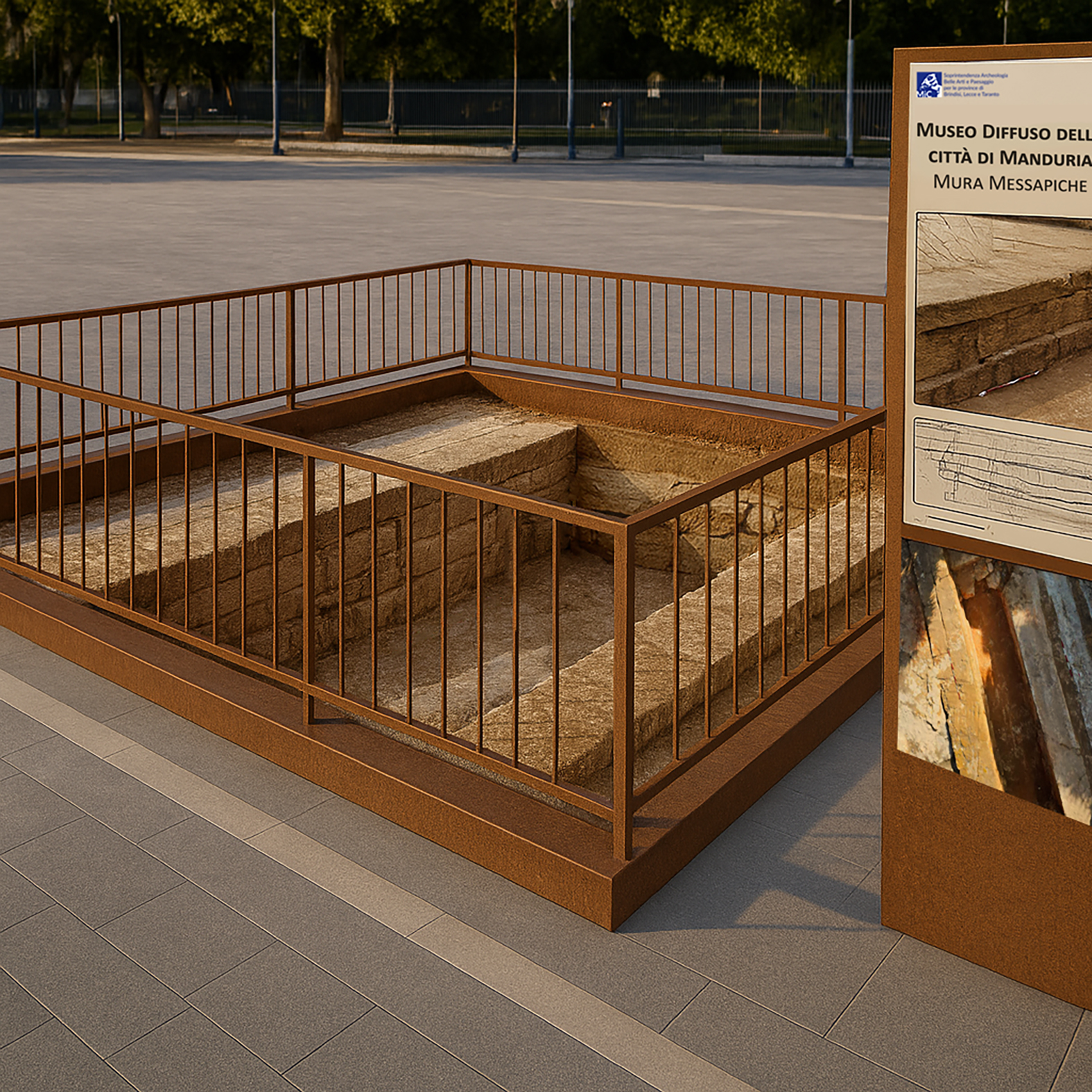 In coerenza con gli indirizzi di tutela e valorizzazione del patrimonio archeologico, e in accordo con Ferrovie del Sud Est, il tratto meglio conservato della cerchia intermedia sarà preservato e lasciato in vista all’interno del futuro hub intermodale. Un adeguato allestimento, corredato da pannelli informativi, consentirà ai viaggiatori di entrare in contatto diretto con le mura dell’antica città messapica, creando un punto di connessione tra le moderne infrastrutture e il vicino Parco Archeologico delle Mura Messapiche.