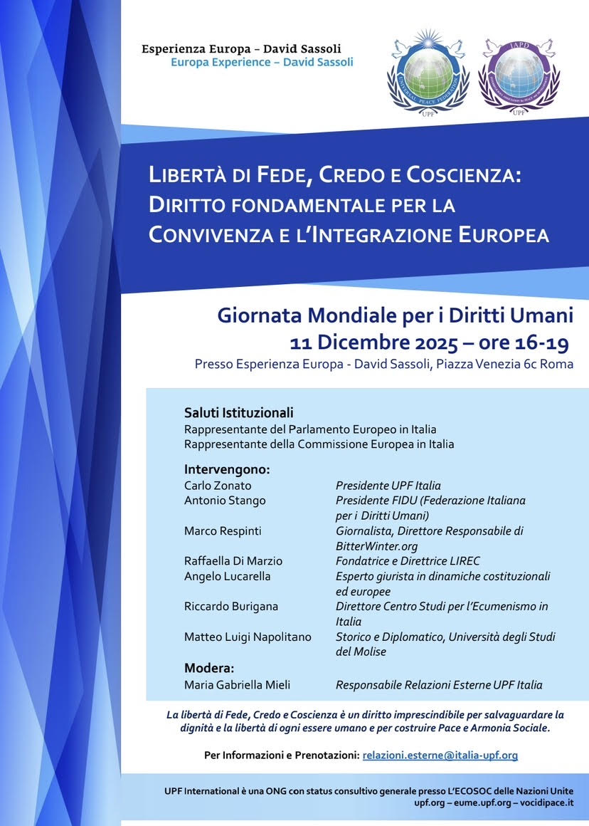 “Libertà di Fede, Credo e Coscienza: Diritto fondamentale per la Convivenza e l’Integrazione Europea”, è il tema del convegno che si terrà giovedì 11 dicembre 2025, dalle ore 16:00 alle 19:00, presso Esperienza Europa, David Sassoli, p.zza Venezia, 6c, Roma.