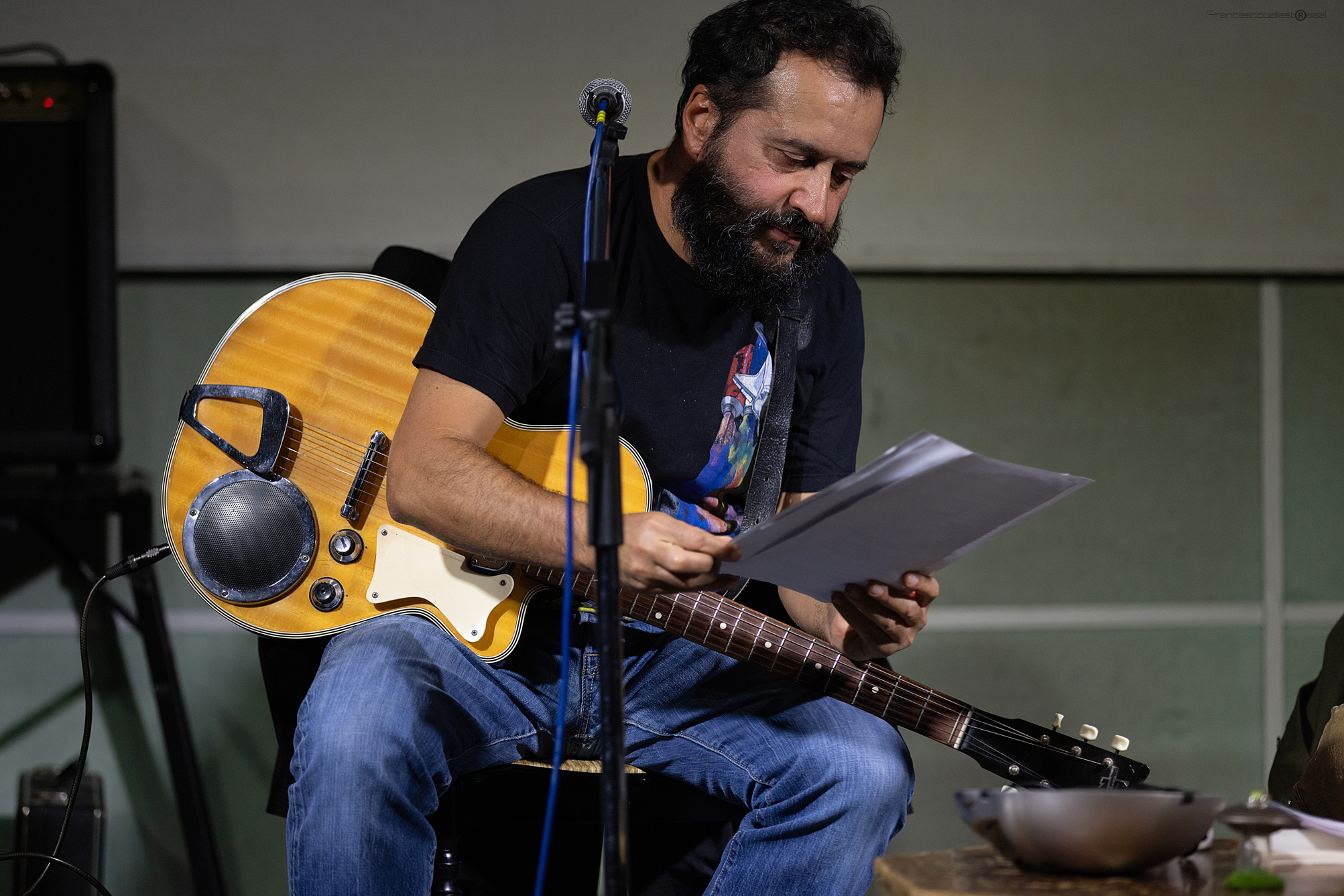 Si è parlato del periodo del Consorzio Produttori Indipendenti, della incredibile esperienza di Materiale Resistente, dei rapporti con le altre band che ci ruotavano dentro come gli Üstmamo, gli Estasia, i Disciplinatha, gli Ulan Bator e tutti gli altri. Sono venuti fuori retroscena e aneddoti legati nel tempo al rapporto con Giovanni Lindo Ferretti e Massimo Zamboni. Si è parlato anche della sua laurea al Dams di Bologna (della mia frequenza di un paio di corsi sempre al Dams nei primi ‘80, io ero a Lettere), dei concerti un po’ in tutta Italia, di quando gli AFA suonarono a Melissano a due passi da me (io c’ero, ovviamente), del successo straordinario di “Nomade Psichico”, forse il disco più importante uscito fuori tra tutti i gruppi del Consorzio; di dove sta andando a parare il rock, in che cosa si è trasformato, della nuova musica italiana in odor di rinascimento, della nuova generazione di musicisti che non cerca consensi a tutti i costi, facendo dischi belli di respiro internazionale, che se ne infischiano se non vengono passati in radio; di Luciano Ligabue (suo compaesano), di suo fratello Davide meglio noto come Little Taver, (che con Ligabue ci ha fatto insieme un po’ di cose, non ultima l’interpretazione di se stesso in “Radiofreccia”) musicista e attore istrionico, “rocker” vulcanico, ironico e frontman di una band che è tutto un programma: “Little Taver and His Crazy Alligators” (Little Taver è anche il gestore de “La Galera”, il locale dove io e Fabrizio abbiamo presentato “Il delicato mondo di Nick Drake”). Parlando e discutendo il tempo è passato, intanto ci aveva raggiunti Simone Romei (Des Moines), un musicista di Reggio Emilia che di lì a poco ha regalato a chi c’era alla “Galera” emozioni e bellezza. La sua esecuzione di tutte le canzoni di “Pink Moon” di Nick Drake è stata fantastica: chitarra scordata e riaccordata per ogni brano, fedele al metodo usato da Nick.