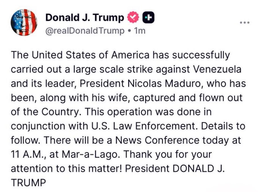 Donald Trump ha rotto il silenzio alle 10.30 con un post social: “Il presidente del Venezuela Nicolas Maduro e sua moglie sono stati catturati e sono stati portati fuori dal Paese. L’operazione è stata condotta con successo contro il Venezuela e contro il suo leader. Seguiranno dettagli” – previsti in una conferenza stampa fissata alle 17 ora italiana nella sua residenza privata di Mar-a-Lago.
