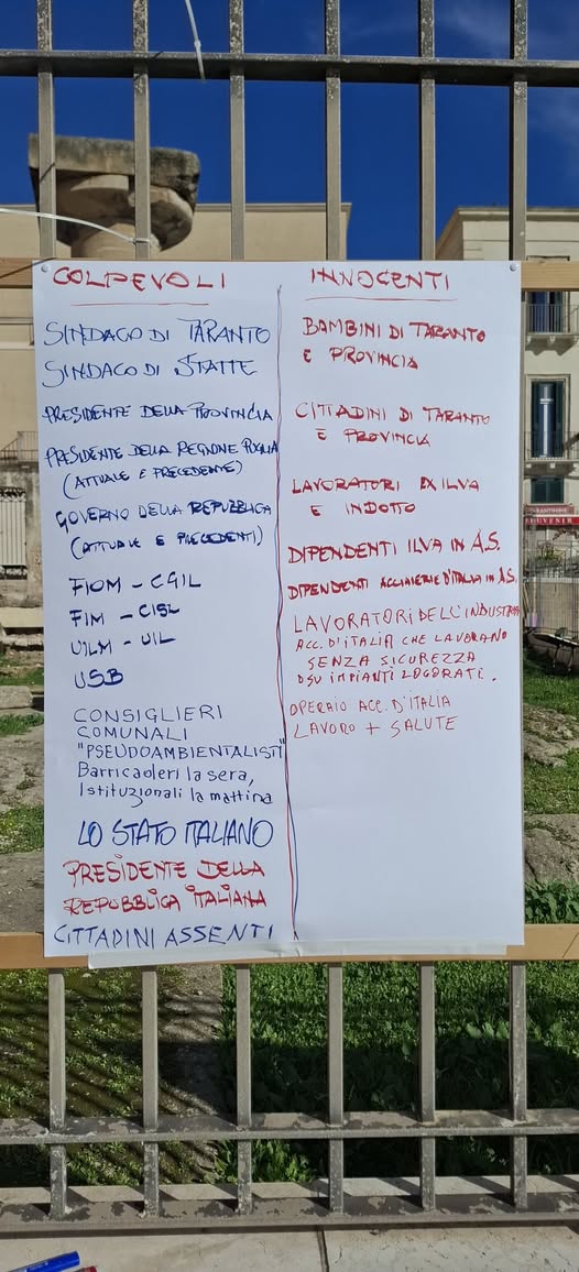(g.p.) ______________ Nuova protesta organizzata questa mattina a Taranto, in piazza Castello, promossa dalle associazioni Genitori Tarantini, Comitato Cittadini e Lavoratori Liberi e Pensanti, Lavoratori metalmeccanici organizzati e Terra Jonica, seguita da pubblico dibattito a pomeriggio.