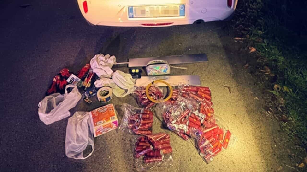 All’interno dell’auto sono stati trovati, occultati tra vestiti e altri oggetti, due congegni metallici artigianali utilizzati per far saltare gli sportelli automatici, insieme ai candelotti esplosivi, a un tratto di miccia a combustione lenta di colore giallo, rotoli di nastro e materiale cartaceo. Vista la pericolosità del contenuto, è stato richiesto l’intervento degli artificieri, che hanno provveduto alla messa in sicurezza e alla successiva neutralizzazione degli ordigni, giudicati completi e pronti all’uso.