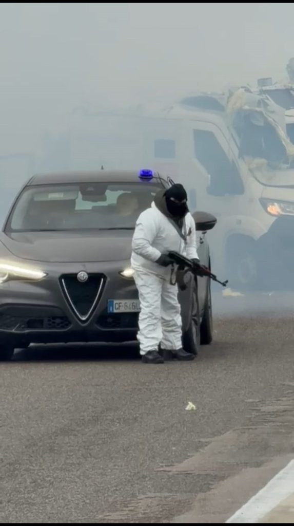 Secondo le prime ricostruzioni, il commando — formato da almeno quattro persone e dotato di armi lunghe — ha preso di mira due veicoli di un istituto di sicurezza privata. Per fermare la circolazione e creare un varco operativo, i malviventi avrebbero piazzato un furgone di traverso sulla carreggiata e gli avrebbero dato alle fiamme, generando il blocco del traffico e una colonna di veicoli.