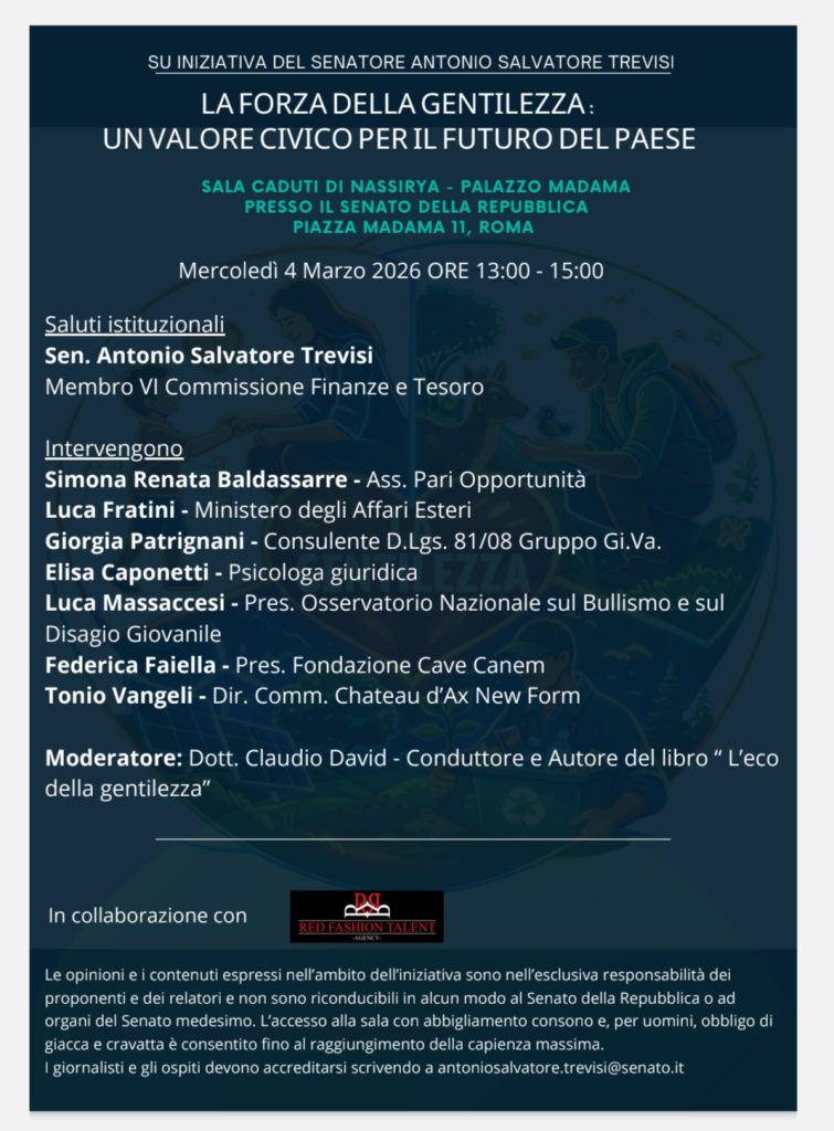L’evento, promosso dal Senatore Antonio Trevisi, ( Membro della VI commissione Finanze e Tesoro) rappresenta un’occasione unica per valorizzare l’etica, la responsabilità sociale e la gentilezza come strumenti concreti di crescita personale, culturale e imprenditoriale. È un momento in cui esperienze e visioni si incontrano, dimostrando che fare impresa con cuore e professionalità non è solo possibile, ma necessario per costruire una società più sostenibile, inclusiva e orientata al bene comune.“Investire nella gentilezza significa investire nel futuro”, conclude Vangeli. “Ogni gesto, ogni decisione, ogni scelta imprenditoriale può lasciare un’impronta positiva. E questa è la vera eredità che possiamo offrire alle generazioni che verranno”.