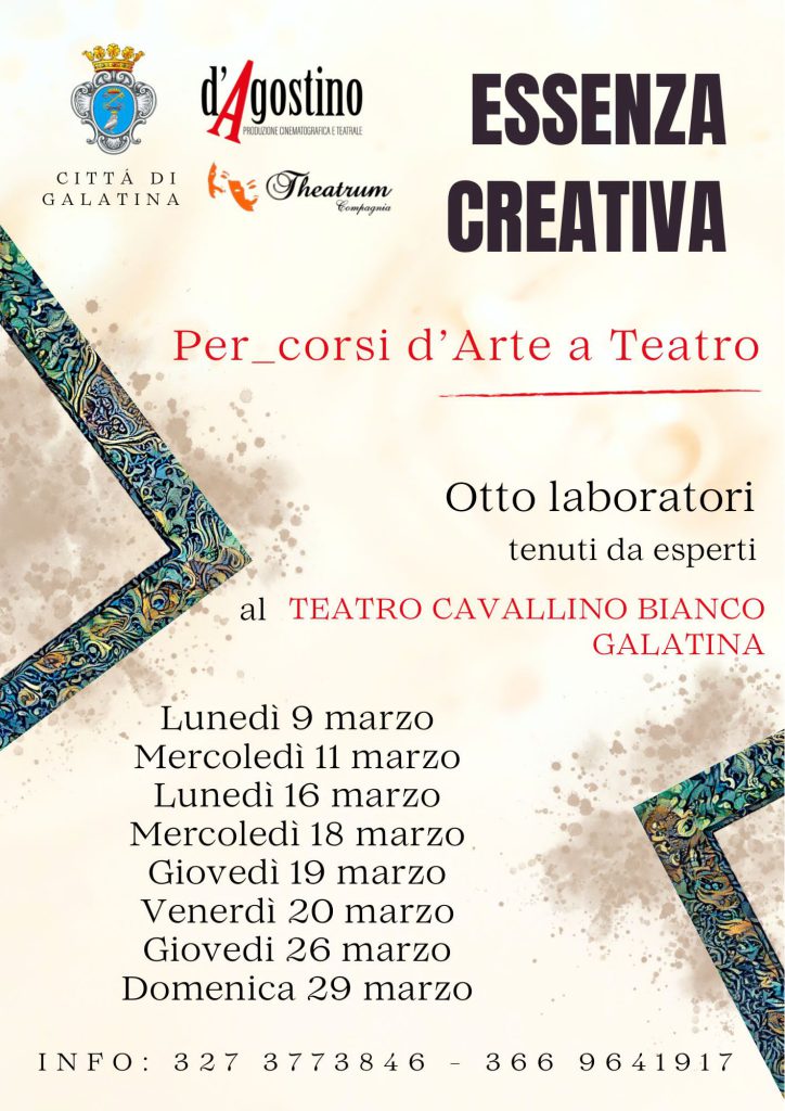 L’iniziativa, realizzata in collaborazione con l’Amministrazione Comunale di Galatina, a cura della Vito D’Agostino produzioni e Compagnia Theatrum, vuole offrire alla cittadinanza uno spazio di incontro e di creatività, in cui le diverse forme artistiche diventano strumenti di espressione, crescita personale e dialogo.