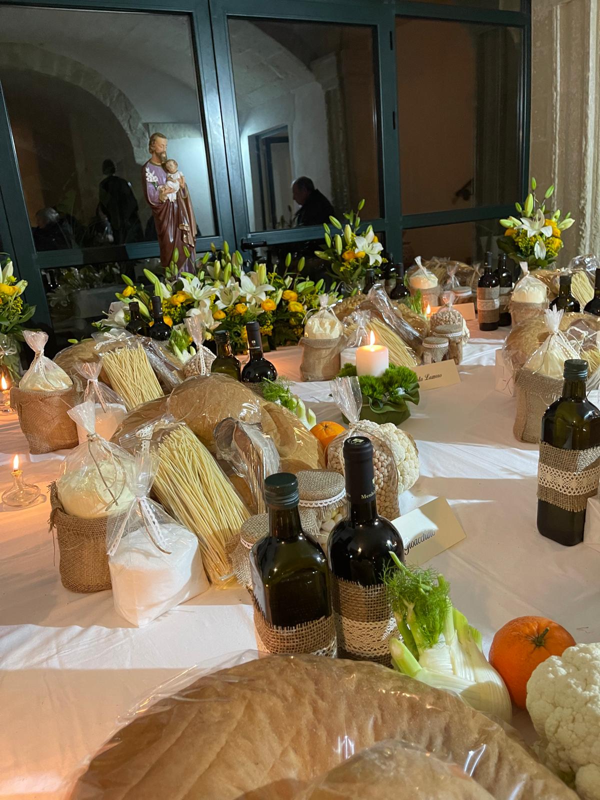 Le Tavole, allestite come atto devozionale per grazia ricevuta, richiesta di intercessione o semplicemente come atto di carità, vengono preparate con estrema cura, seguendo regole rituali, utilizzando le tovaglie più preziose, fiori, ceri accesi come omaggio all’immagine o alla statua del santo. Le pietanze – ben 169 piatti, esattamente 13 pietanze per ciascuno dei 13 Santi presenti – sono cariche di simbologia cristiana e fanno parte della tradizione gastronomica rurale del Salento, massima espressione della sua stagionalità: non a caso, durante la festa, anche i ristoranti del territorio mettono in carta un piatto espressione della festa. Ogni pietanza racconta una storia, ogni gesto rimanda a un valore: l’attesa, la tavola imbandita, il cibo condiviso, i gesti ripetuti della tradizione che non sono solo memoria, ma segni vivi di una cultura della responsabilità e di una rinnovata giustizia, in primis sociale: in questa edizione della festa, infatti, il valore tradizionale delle Tavole di San Giuseppe si coniuga alla cultura della responsabilità civica e consapevole, della legalità come valore assoluto. Buona parte del cibo prodotto per la festa andrà alla Caritas e ad associazioni del territorio che si occupano di bisognosi, ha spiegato in conferenza stampa don Matteo Brunetta, parroco di San Michele Arcangelo e di San Biagio VM, sottolineando ancora una volta le doti di umiltà, disponibilità e responsabilità di San Giuseppe”, pronto a farsi carico comunque di un bimbo che non aveva generato. ____________