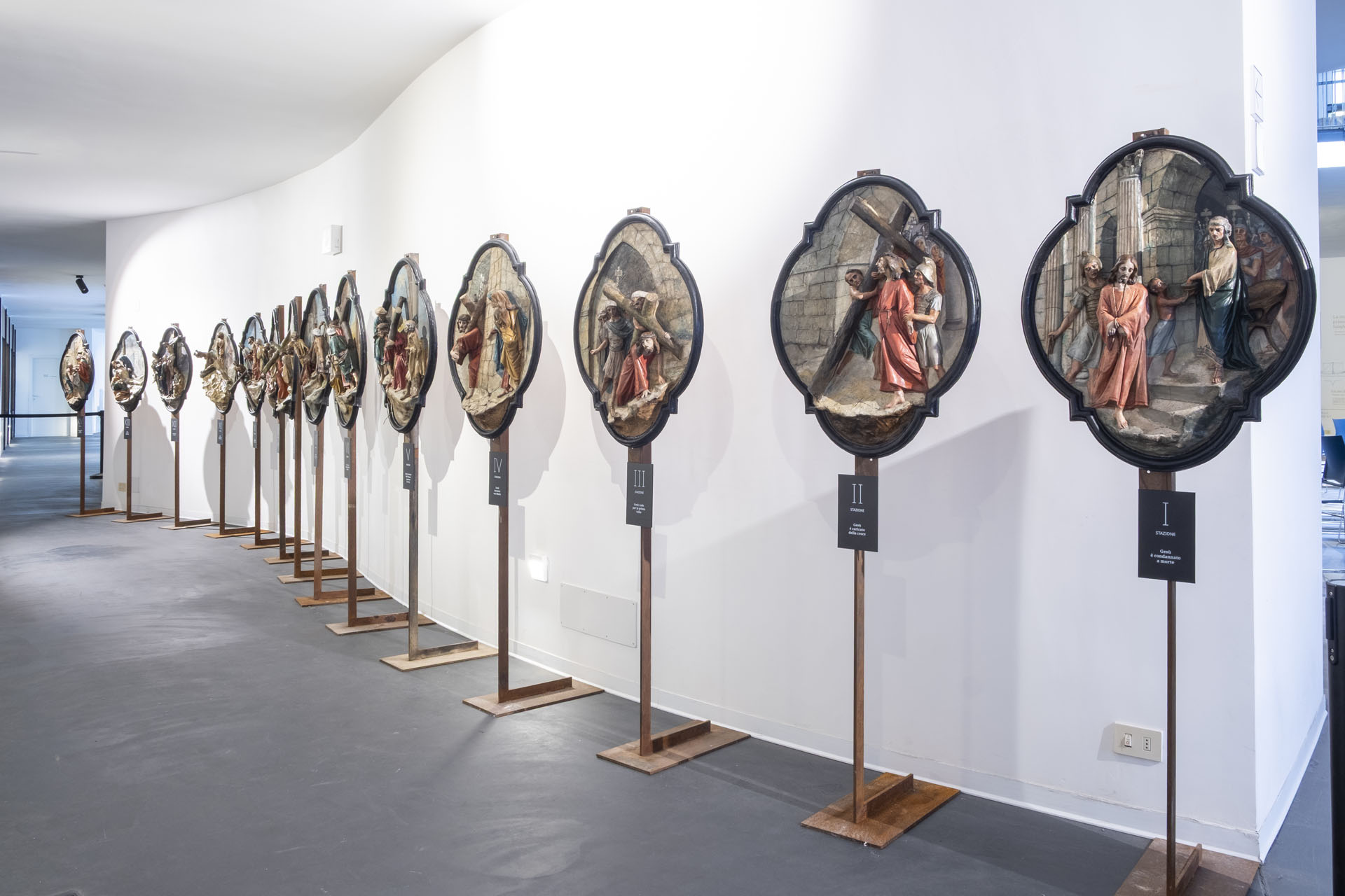 Le quattordici tavole – che i visitatori potranno ammirare da vicino prima che al termine del restauro della chiesetta ritornino al loro posto, in alto, lungo il perimetro della chiesetta – rappresentano i momenti della Passione del Cristo in una tensione altamente drammatica che attraversa e anima le posture e gli sguardi dei personaggi che le compongono. Particolare è infatti la visione di Caretta nel suo interpretare la cartapesta con una pratica capace di scandagliare tutte le opportunità che la materia poteva offrirgli nella composizione delle sue opere, maestro, nell’accostare, nei suoi basso e altorilievi, scenografia, pittura e scultura. Le sue opere non sono semplici simulacri devozionali, ma sculture cariche di un realismo vibrante e di un’introspezione psicologica che trasforma la carta e la colla in carne sofferente. La sua Via Crucis rappresenta il culmine di questa ricerca: ogni stazione è un fermo immagine drammatico, dove il contrasto tra la fragilità del materiale e la forza del messaggio spirituale crea un impatto emotivo profondo”.