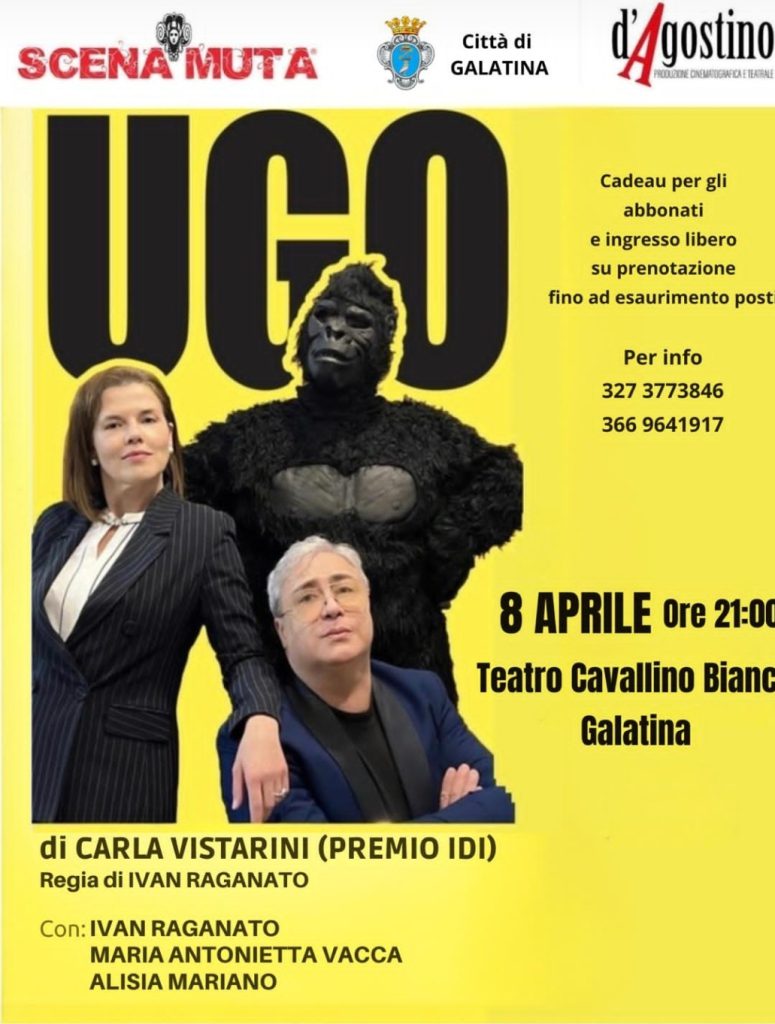 “Ci vorrebbe un gorilla come UGO, nella vita di ognuno per capire cosa conta veramente: conservare sempre la capacità di sorprendersi come fanno i bambini, la voglia di dare una possibilità all’impossibile, la gioia di accettare il cambiamento, la disponibilità ad amare e riprendere il cammino interrotto con più entusiasmo di prima, senza temere di mostrare emozioni, di ridere e piangere, di commuoversi e gioire. Tutto in allegria, quell’allegria che si chiama UGO.” Scrive Carla Vistarini e continua: “UGO torna al suo pubblico, questa volta a Galatina (LE), con Ivan Raganato, Maria Antonietta Vacca, Alisia Mariano, compagnia di Scena Muta. Regia di Ivan Raganato. Una serata speciale, da segnarsi nel cuore. Buon divertimento al fortunato pubblico e in bocca al lupo agli incliti attori. Al Teatro Cavallino Bianco.”