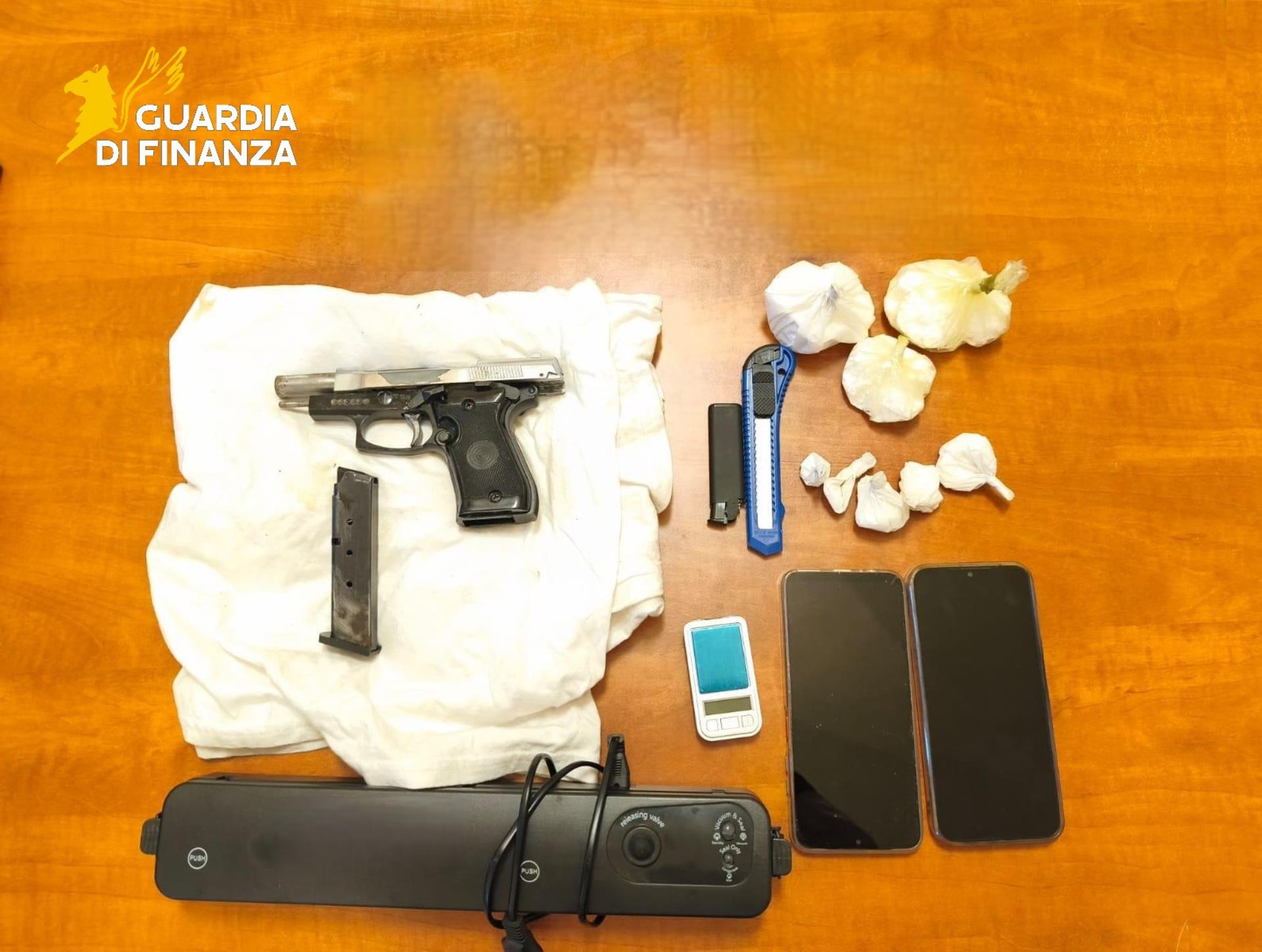 Le ulteriori attività di ricerca, estese anche al luogo dove il soggetto stava dimorando in quel momento ed al motoveicolo in suo possesso, hanno consentito di rinvenire ulteriore sostanza stupefacente dello stesso tipo, per un ammontare complessivo di circa 150 grammi, diverso materiale per il confezionamento nonché una pistola con matricola abrasa ma priva di munizionamento.