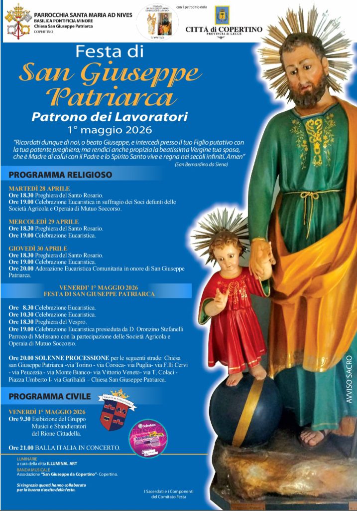 (Rdl) _______________ Copertino si prepara a vivere uno dei momenti più sentiti della propria tradizione religiosa e popolare: la Festa di San Giuseppe Patriarca, Patrono dei Lavoratori, in programma venerdì 1° maggio 2026, promossa e organizzata dal Comitato Festa con la collaborazione della comunità parrocchiale.